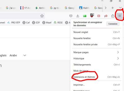 - Pour commencer clic droit, en haut a droite sur les trois tirets ou (points), un sous menu s'ouvre avec le choix “Extensions et thèmes”.