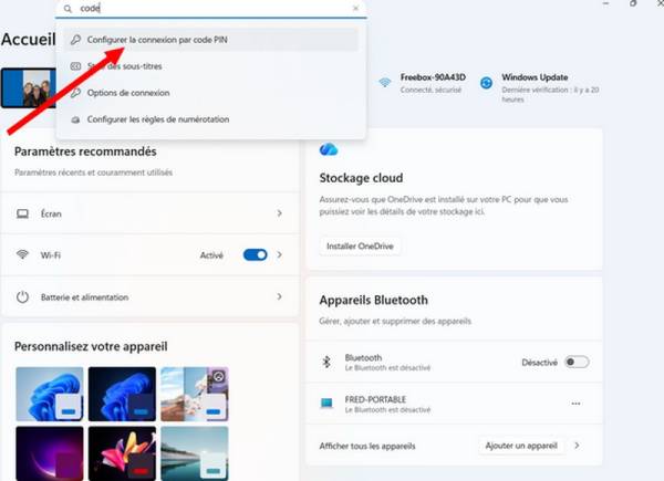 - Taper “code pin” dans la barre de recherche.