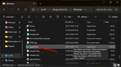 - Jusqu’à trouver “regedit.exe”, et double clic.